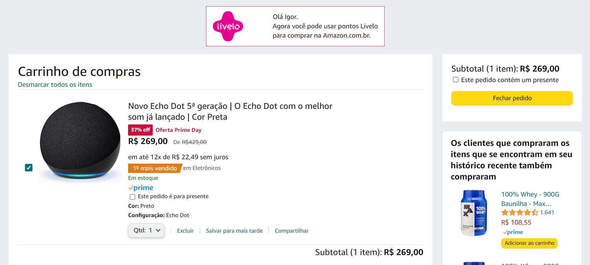 1 – Assim que você vincula sua conta da Livelo junto à Amazon, ao adicionar um produto no carrinho, já é informada a possibilidade de pagar suas compras com os pontos: