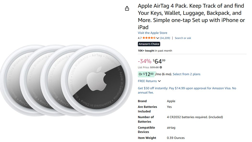 Veja abaixo o exemplo de compra do Apple AirTag (pacote com 4 unidades) vendido pelo site da Amazon dos EUA: