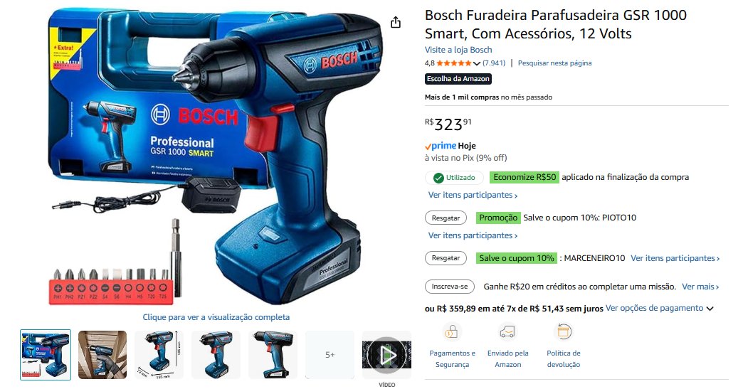 - Bosch Furadeira|9% de desconto| total R$ 323,91 – compre aqui