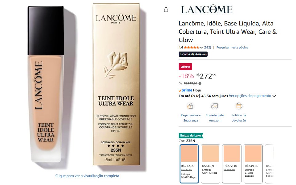 - Lancôme base líquida|18% de desconto – total R$ 272,99 – compre aqui