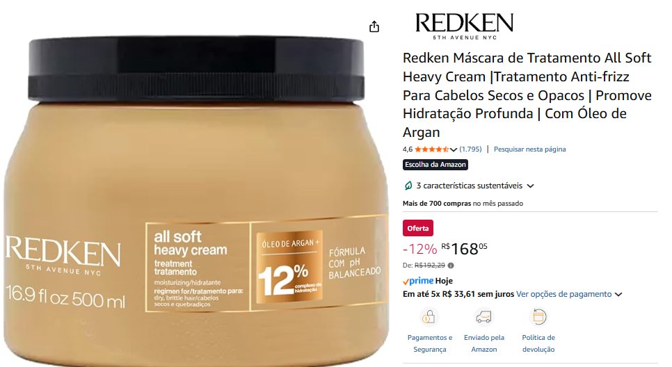 - Redken Máscara de Tratamento |12% de desconto – total R$ 168,05 – compre aqui
