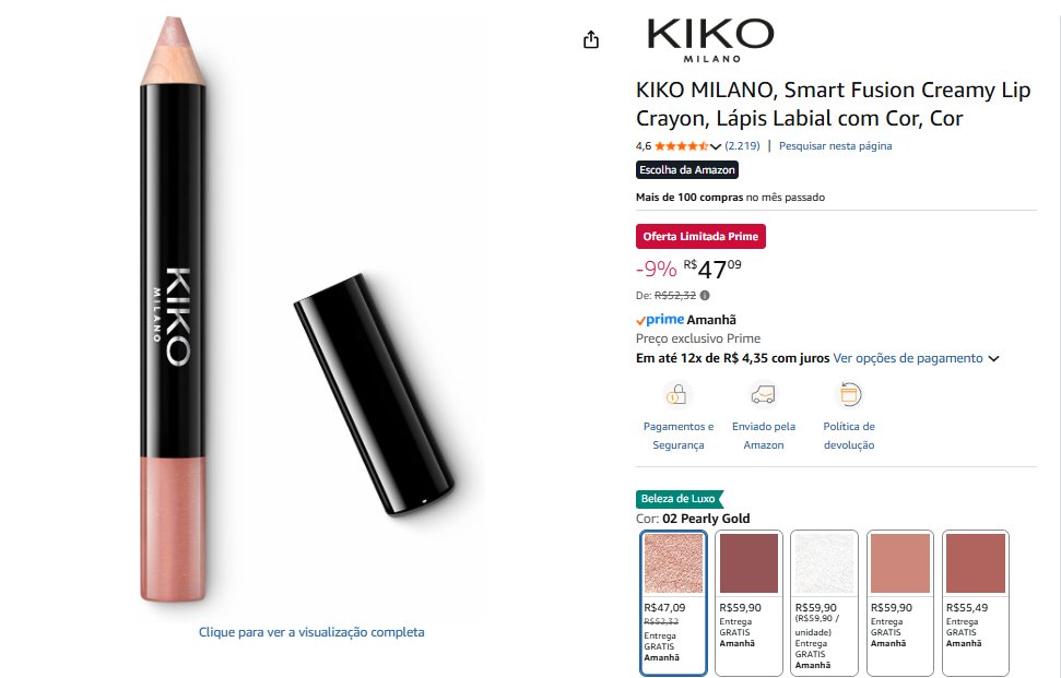 - Lápis labial com cor | 9% de desconto – total R$ 47,09 – compre aqui