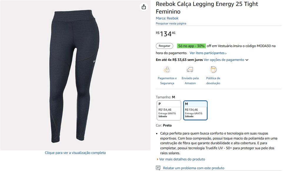 - Reebok calça legging | 30% de desconto| total R$ 134,46 – compre aqui