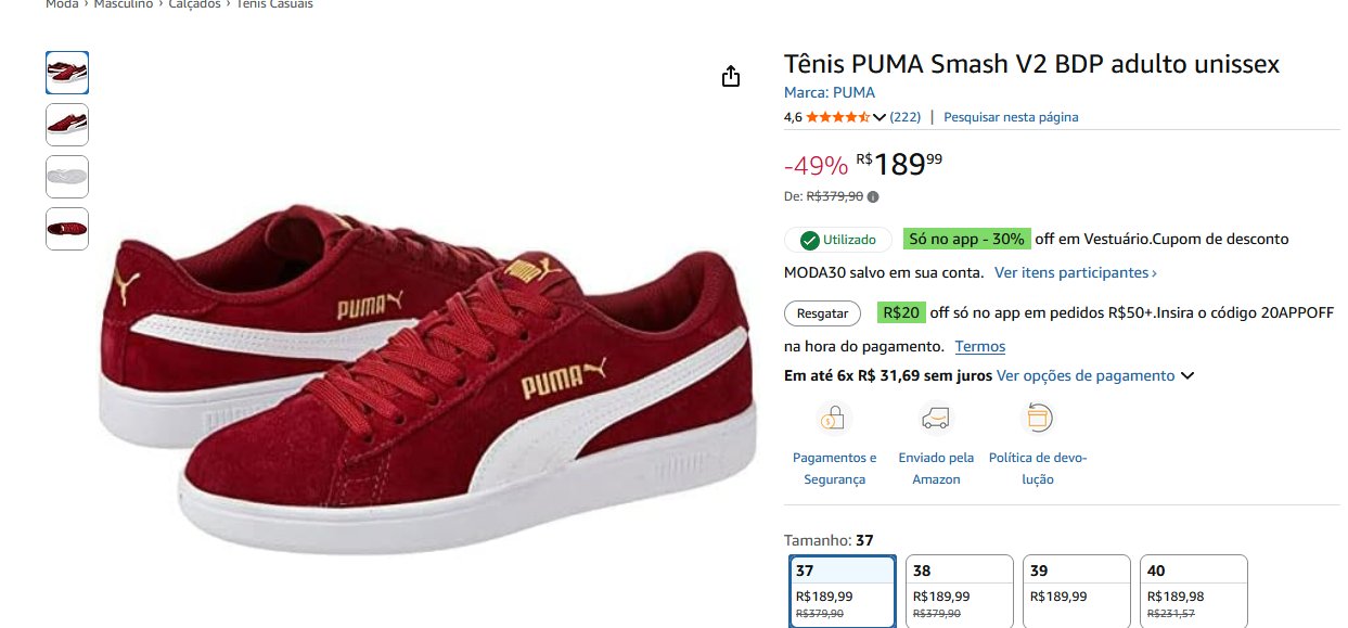- Tênis Puma |49% de desconto| total R$ 189,99 – compre aqui
