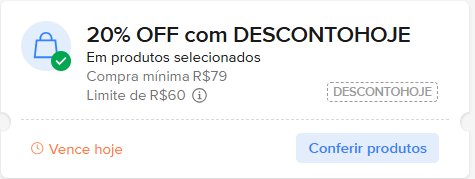 - 20% off, chegando até R$ 60 de desconto, em compras a partir de R$ 79, com o cupom ‘DESCONTOHOJE‘ [sem aspas];