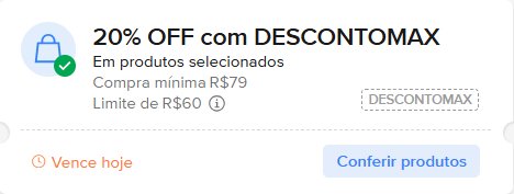 - 20% off, chegando até R$ 60 de desconto, em compras a partir de R$ 79, com o cupom ‘DESCONTOMAX‘ [sem aspas];