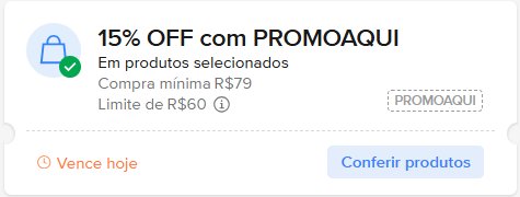 - 15% off, chegando até R$ 60 de desconto, em compras a partir de R$ 79, com o cupom ‘PROMOAQUI‘ [sem aspas];