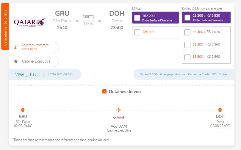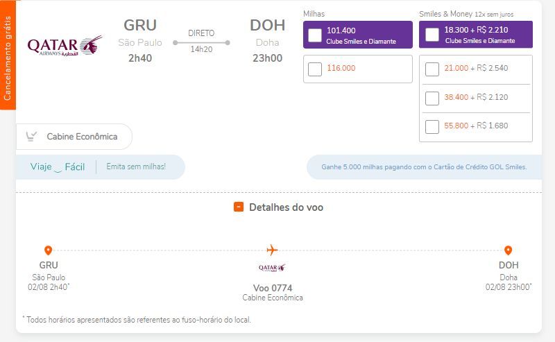 Para quem utiliza os programas de fidelidade nacionais, é possível emitir passagens para voar com a Qatar Airways através de dois programas: Smiles e LATAM Pass. Veja exemplos abaixo: