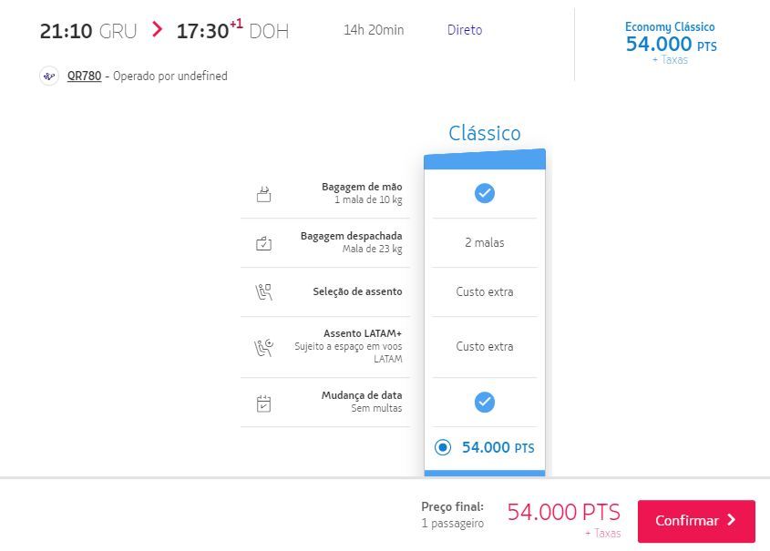 Lembrando que também é possível emitir voos da Qatar Airways com pontos e milhas de outros programas de fidelidade, em especial de companhias da oneworld, como o AAdvantage (American Airlines), Executive Club (British Airways) ou Iberia Plus (Iberia), por exemplo.