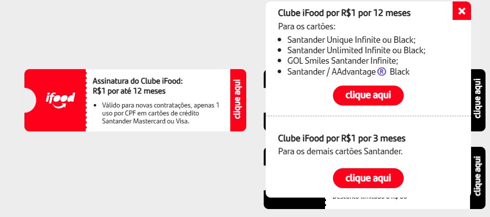 Quem possui os cartões elegíveis do Santander tem a oportunidade de assinar o Clube iFood por apenas R$ 1, garantindo diversos benefícios como cupons de desconto e promoções, por até um ano dependendo do cartão de crédito escolhido. É uma ótima oportunidade para economizar.