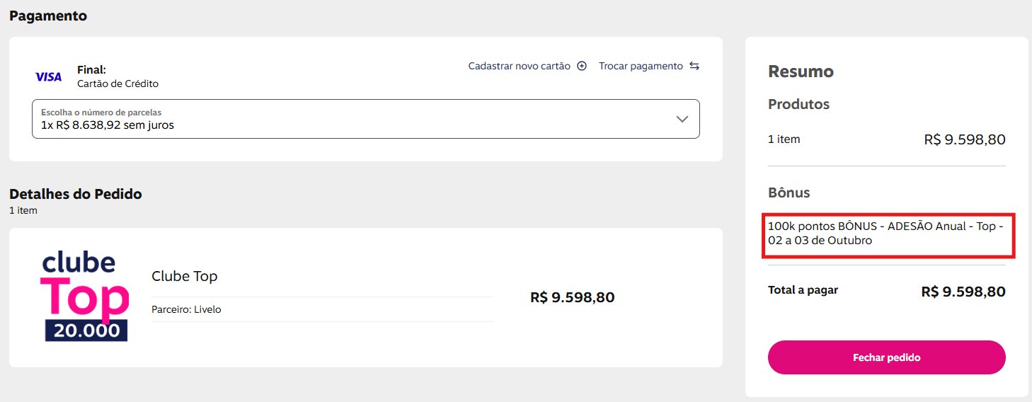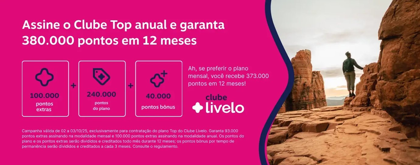 • Campanha válida para adesões ao Clube Livelo Top realizadas nas modalidades de pagamento anual e mensal.