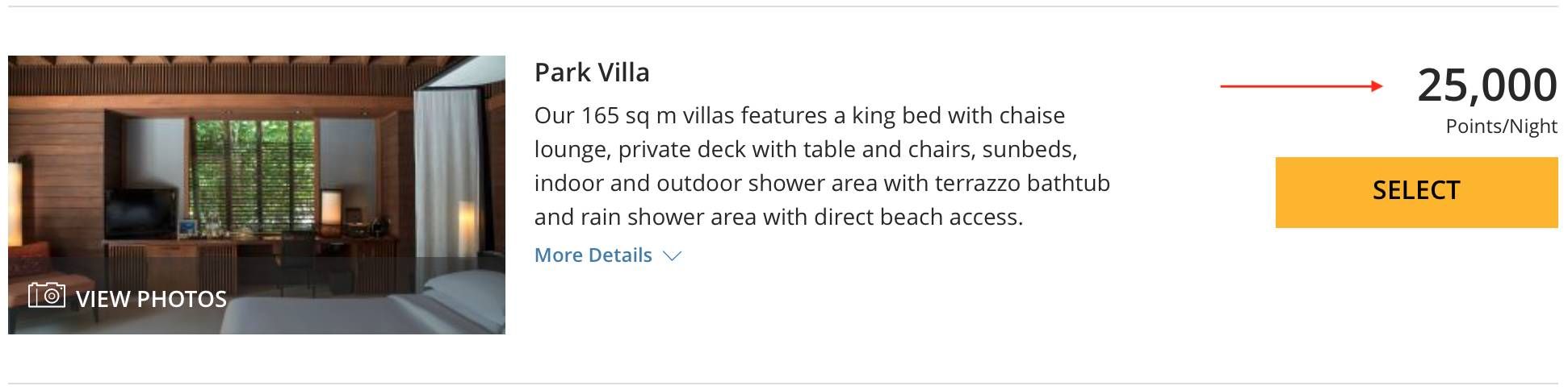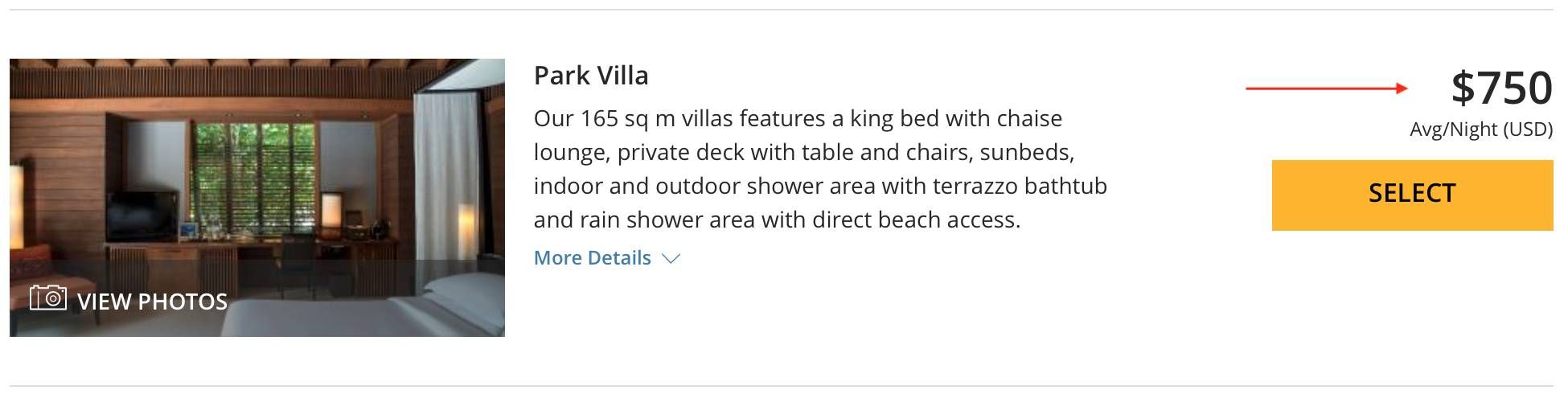 Especificamente para esse hotel a única opção de “quarto” para reserva com pontos é e o Park Villa. Porém é possível fazer o upgrade para outras opções como o Park Water Villa (bangalô na água), pagando uma taxa adicional (que ainda vale a pena)!