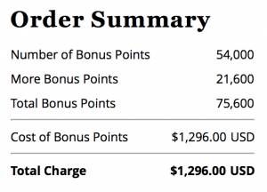 Para nosso exemplo vamos comprar 54.000 pontos, onde é oferecido um bônus de 40% (21.600), resultando em um total de 75.600.