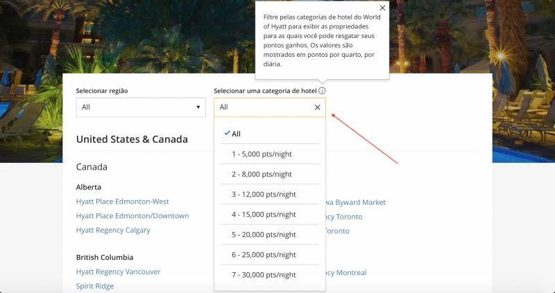 Para saber as categorias dos hotéis Hyatt clique aqui, e filtre as opções conforme a imagem abaixo: