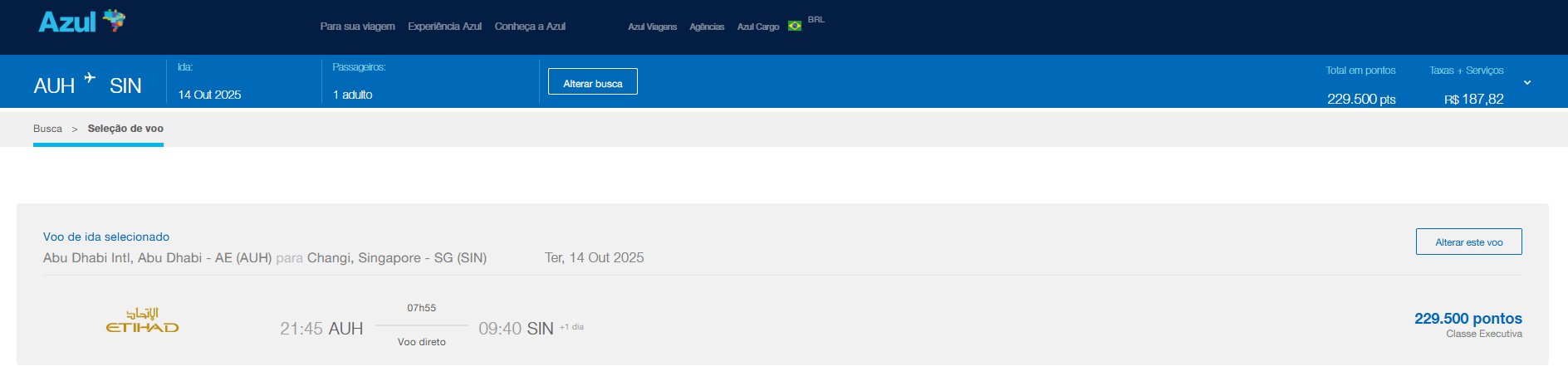 Este resgate destaca-se por oferecer uma excelente oportunidade de voar em uma cabine premium da Etihad Airways, nova parceira da Azul, em uma rota direta até Cingapura, cuja operação tem sido realizada usando o icônico A380-800. Vale lembrar que há vagas para diversos outros destinos da companhia árabe, sempre com excelente precificação, considerando o baixo custo de geração de pontos Azul e a não transferência da indesejada taxa de combustível (YQ).