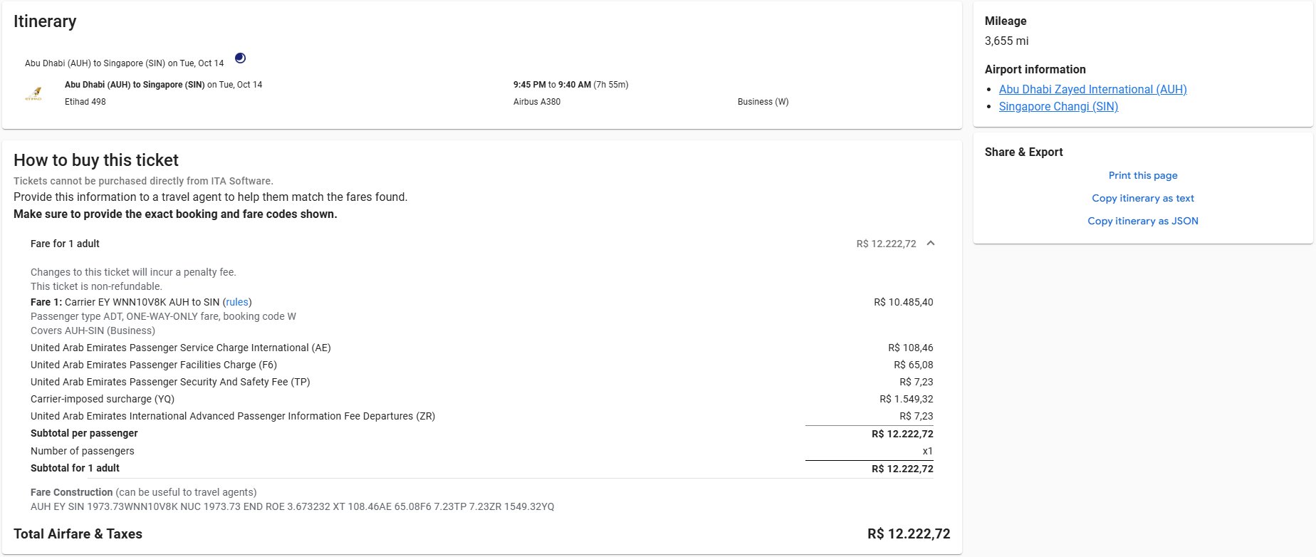 - Voo direto: A disponibilidade de um voo direto entre Abu Dhabi e Cingapura é um diferencial importante, otimizando o tempo de viagem e o conforto. Leve em conta, por outro lado, que é possível partir de outras origens do Oriente Médio, conectando em AUH, pelo mesmo valor. Simulei a partida de Doha, no Qatar, o houve alteração apenas da taxa de embarque.