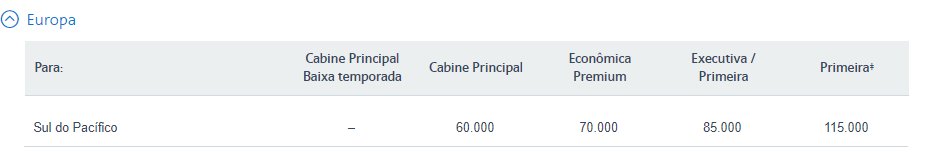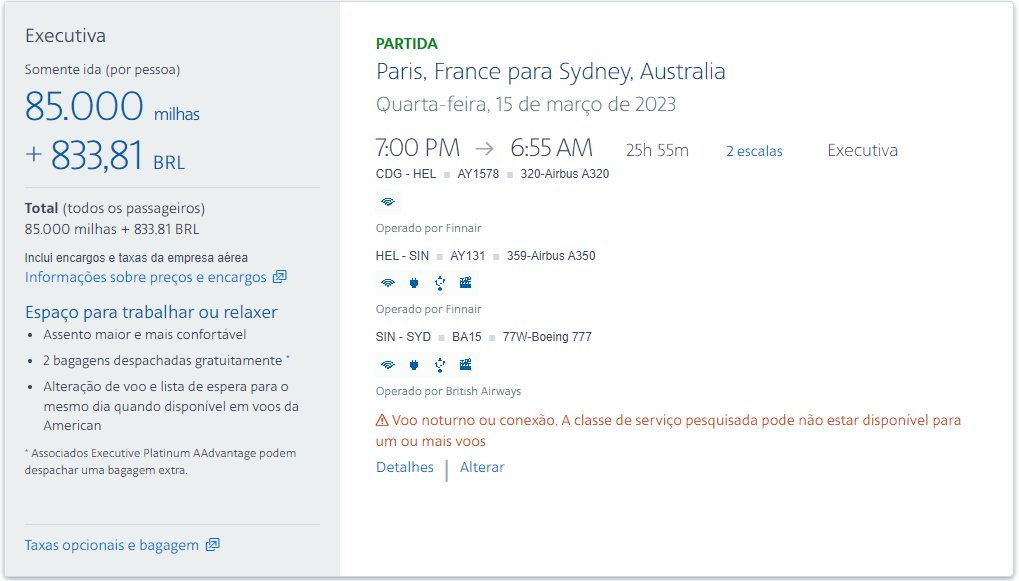 Como falamos, o programa AAdvantage tarifa os voos operados por parceiros com base em tabela fixa, o que traz a grande vantagem da previsibilidade. Para os voos entre Europa e Pacífico Sul, o valor prevista na tabela é de 85.500 milhas para voar em Classe Executiva.