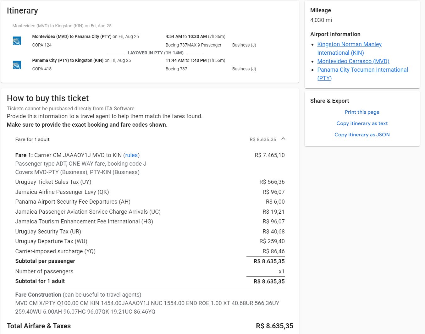 Rota: Montevidéu (MVD) – Cidade do Panamá (PTY) – Kingston (KIN)