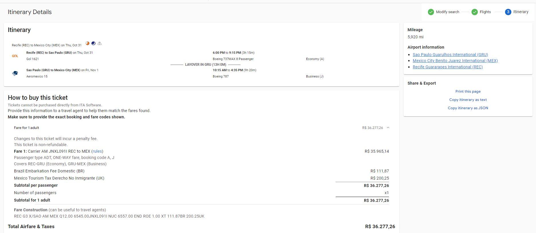 - Rota: Recife (REC) – São Paulo (GRU) – Cidade do México (MEX)