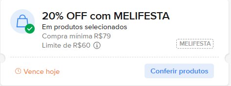 - 20% off, chegando até R$ 60 de desconto, em compras a partir de R$ 79, com o cupom ‘MELIFESTA‘ [sem aspas];