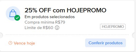 - 25% off, chegando até R$ 60 de desconto, em compras a partir de R$ 79, com o cupom ‘HOJEPROMO‘ [sem aspas];