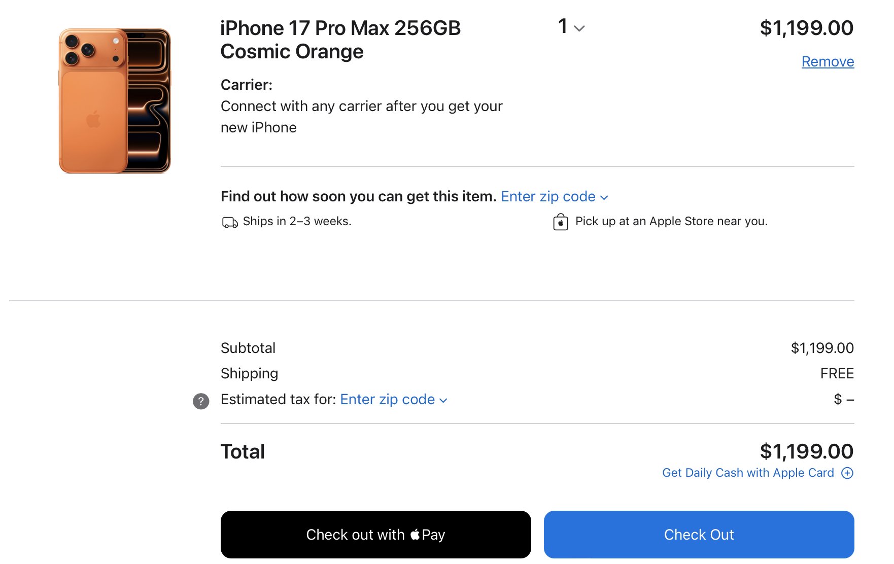 Para ilustrar, veja o preço de um iPhone 17 Pro Max 256 GB no site da Apple EUA. É importante lembrar que a maioria dos estados norte-americanos cobra imposto sobre vendas (sales tax), que deve ser adicionado ao valor final do produto. No entanto, há alguns poucos estados isentos desse imposto, como Delaware. Por isso, usamos um código postal desse estado como referência na simulação abaixo:
