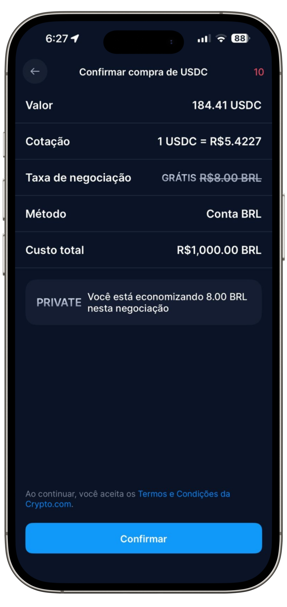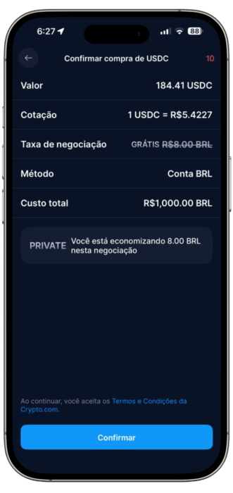 O Cartão Global da Crypto.com opera com USDC, uma stablecoin atrelada ao dólar comercial, que oferece uma alternativa mais econômica ao câmbio tradicional. Ao adquirir USDC (ou outras criptomoedas como BTC e ETH), o usuário se beneficia de taxas mais competitivas em comparação às alíquotas tradicionais, não paga IOF e tem de um spread reduzido. Além disso, clientes com cartões a partir do Plano Plus, não pagam taxa de negociação. Confira abaixo um exemplo de compra de USDC e carregamento do cartão na data de hoje (30/10), com a cotação do dólar oficial em R$ 5,38: