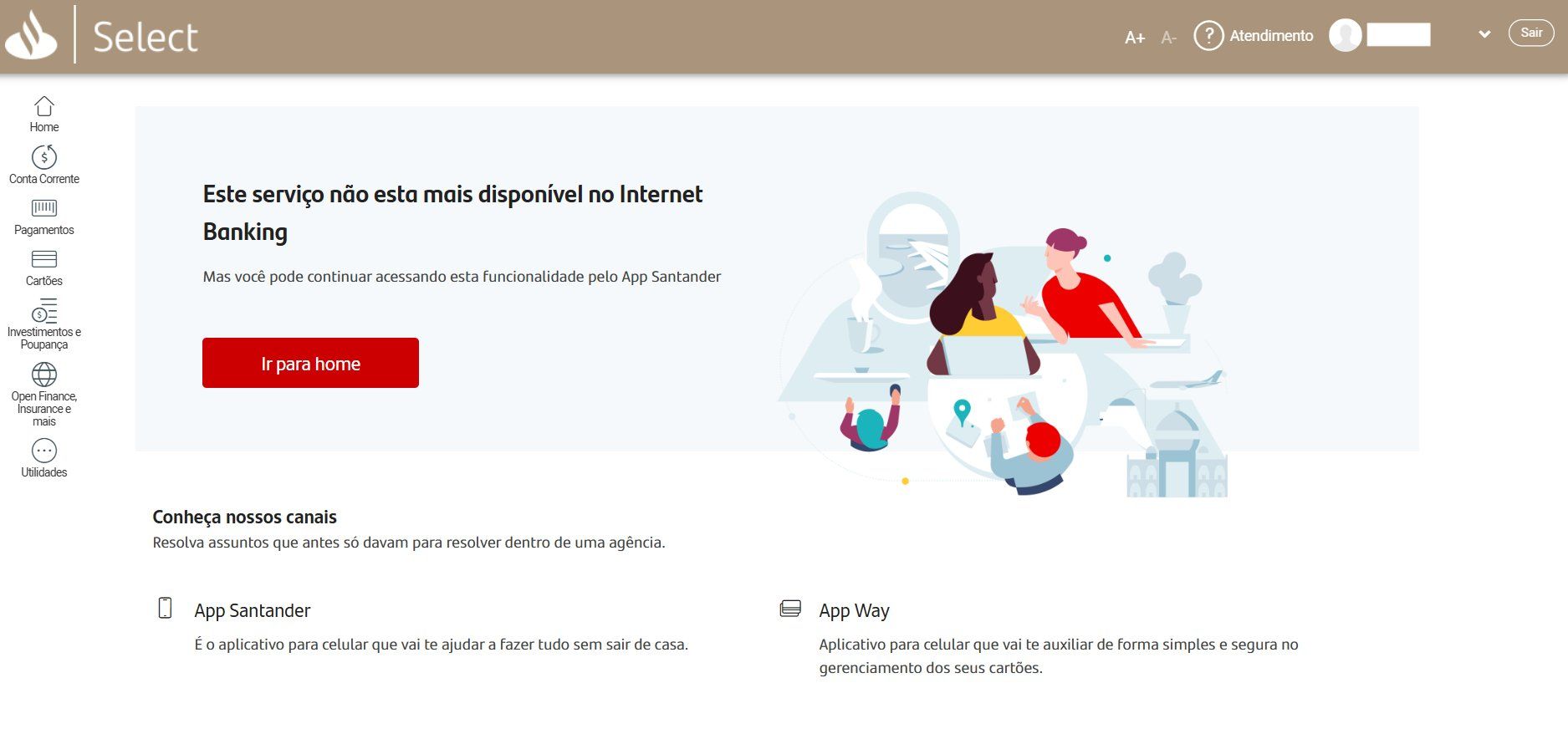 Acessando o internet banking do Santander, podemos ver que o serviço de verificação do extrato não está mais disponível. Por isso, vamos te mostrar como verificar pelos aplicativos do banco.