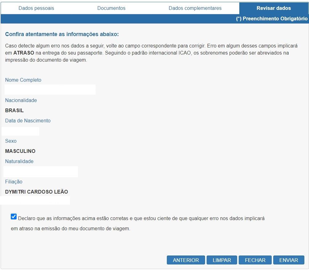 Inicialmente, você deverá acessar o seguinte endereço web: Nova solicitação de passaporte. As duas primeiras telas são de preenchimento bastante intuitivo. Basicamente, você deverá informar o nome do bebê/criança, a filiação, data e local de nascimento, bem como informar dados referentes aos documentos do bebê/criança.