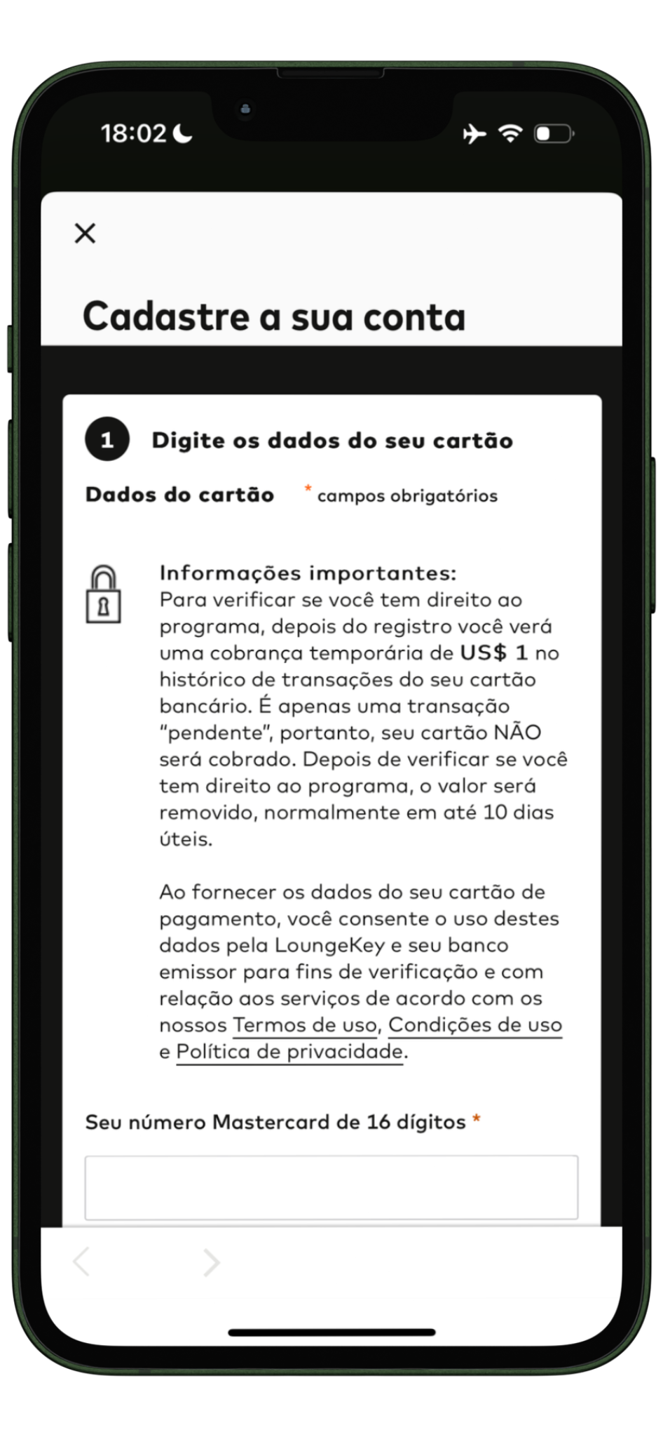 Caso você não possua um conta no Mastercard Airport Experiences, basta acessar o site da Mastercard ou, ainda, baixar o aplicativo para Android ou iPhone, cadastrando seu cartão Mastercard. Caso você possua mais de um cartão, é necessário realizar uma nova conta a cada cadastro.