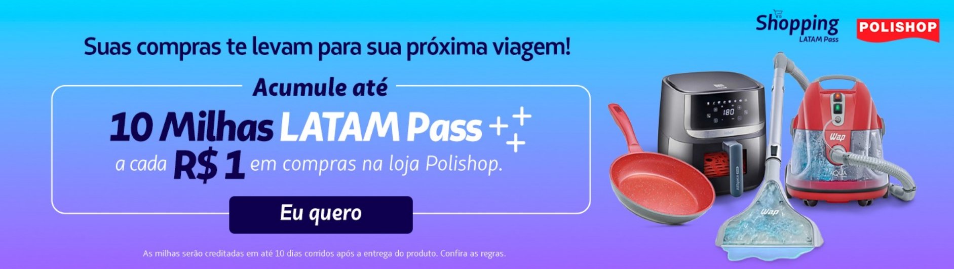 O Shopping LATAM Pass está oferecendo até 10 milhas por real gasto em toda loja Polishop. A oferta, válida até sexta-feira (7), garante a maior pontuação para os assinantes do Clube LATAM Pass e portadores do cartão LATAM Pass Itaú. Confira!