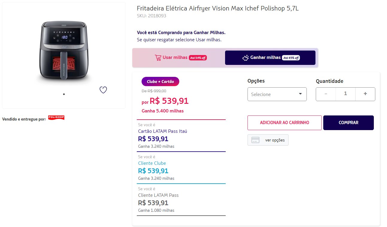 As milhas acumuladas com compras no Shopping LATAM Pass na Polishop podem ser vistas ao lado do produto. Confira este exemplo de compra de uma fritadeira elétrica, que está ofertando 10 milhas por real gasto: