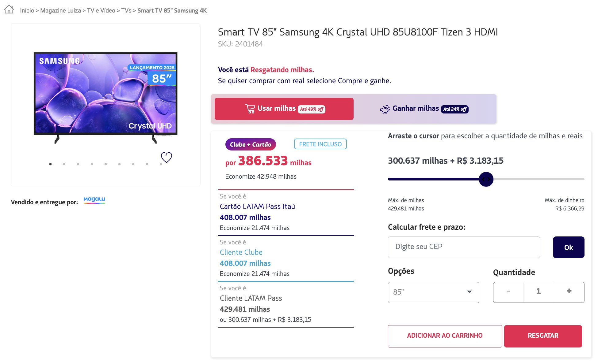 O desconto é válido para o resgate de telas na Magalu pagos integralmente com milhas LATAM Pass. O valor do desconto varia dependendo do produto, da categoria do cliente, da assinatura do Clube LATAM Pass ou do porte do cartão co-branded, sendo o valor máximo 50%.