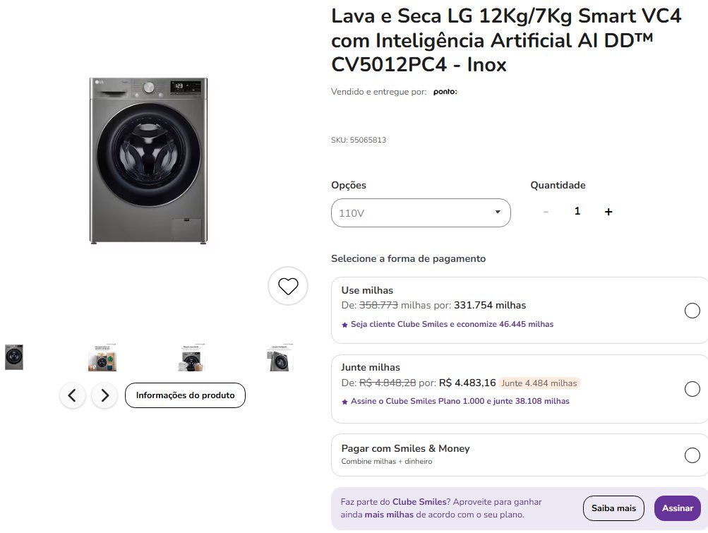 As milhas acumuladas com a compra podem ser vistas ao lado do preço do produto. Veja alguns exemplos: