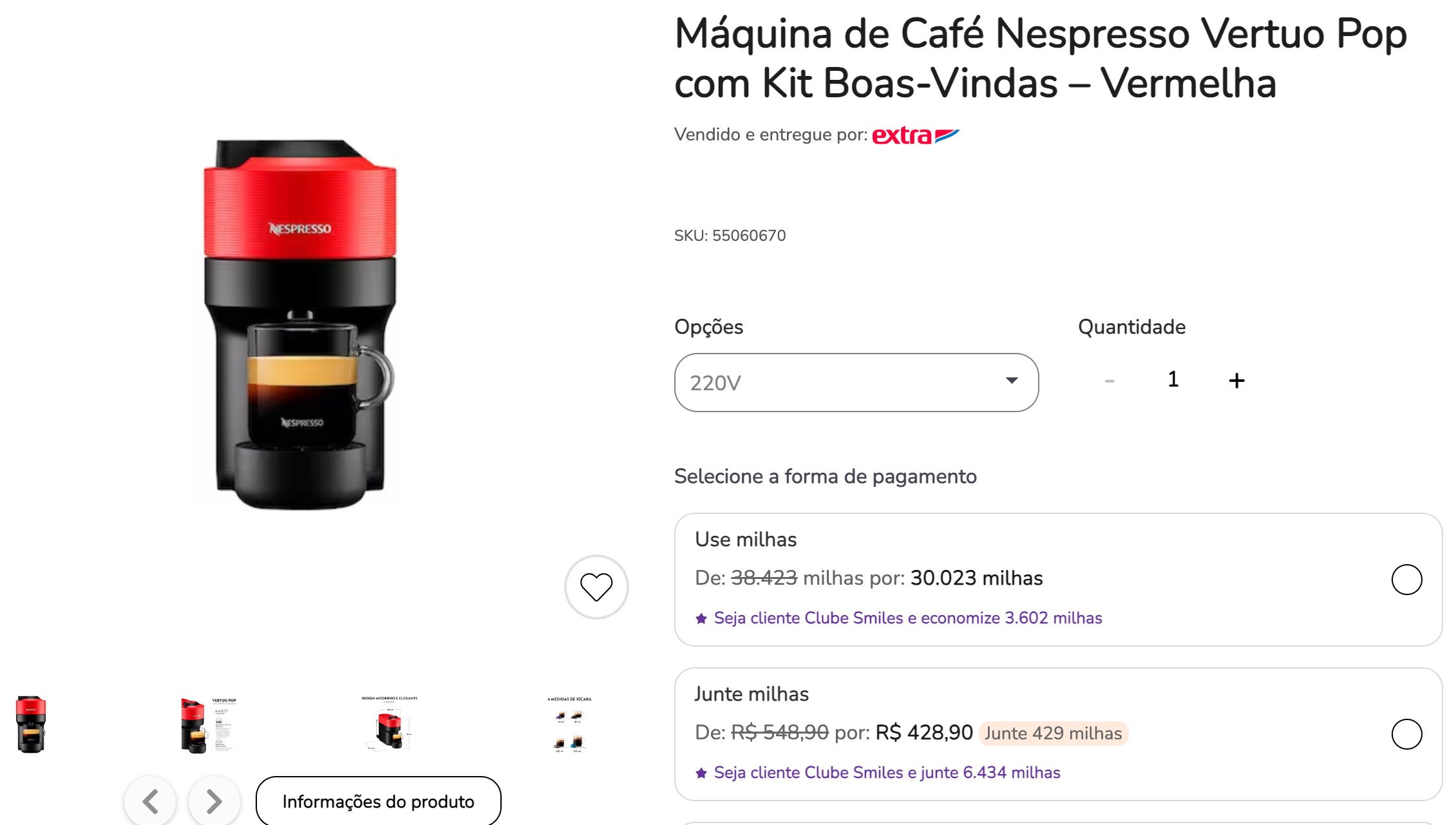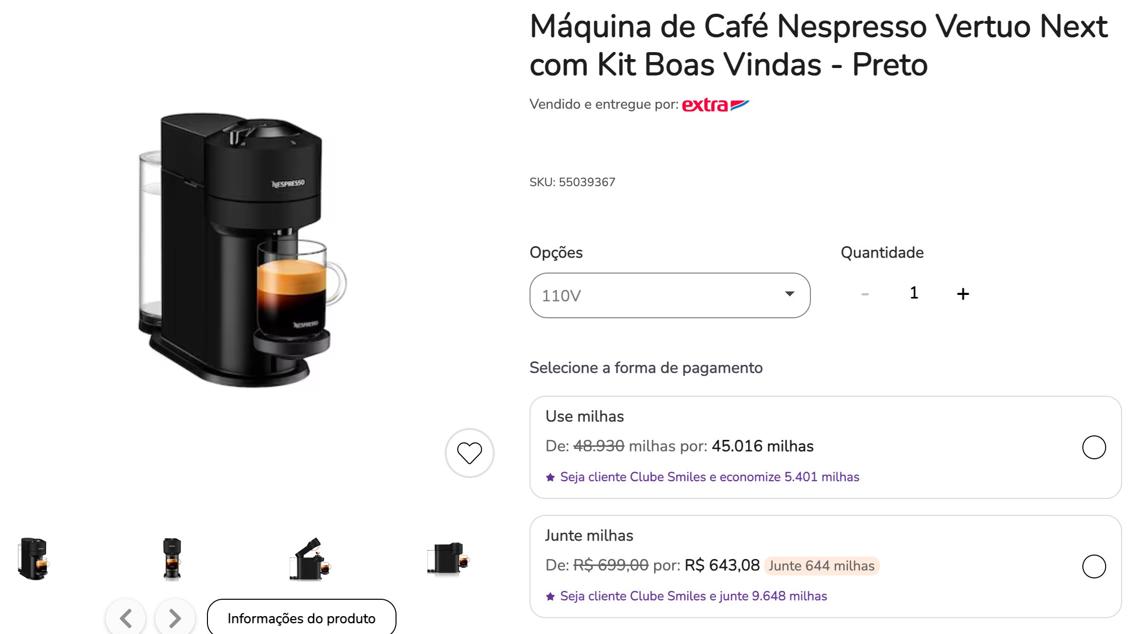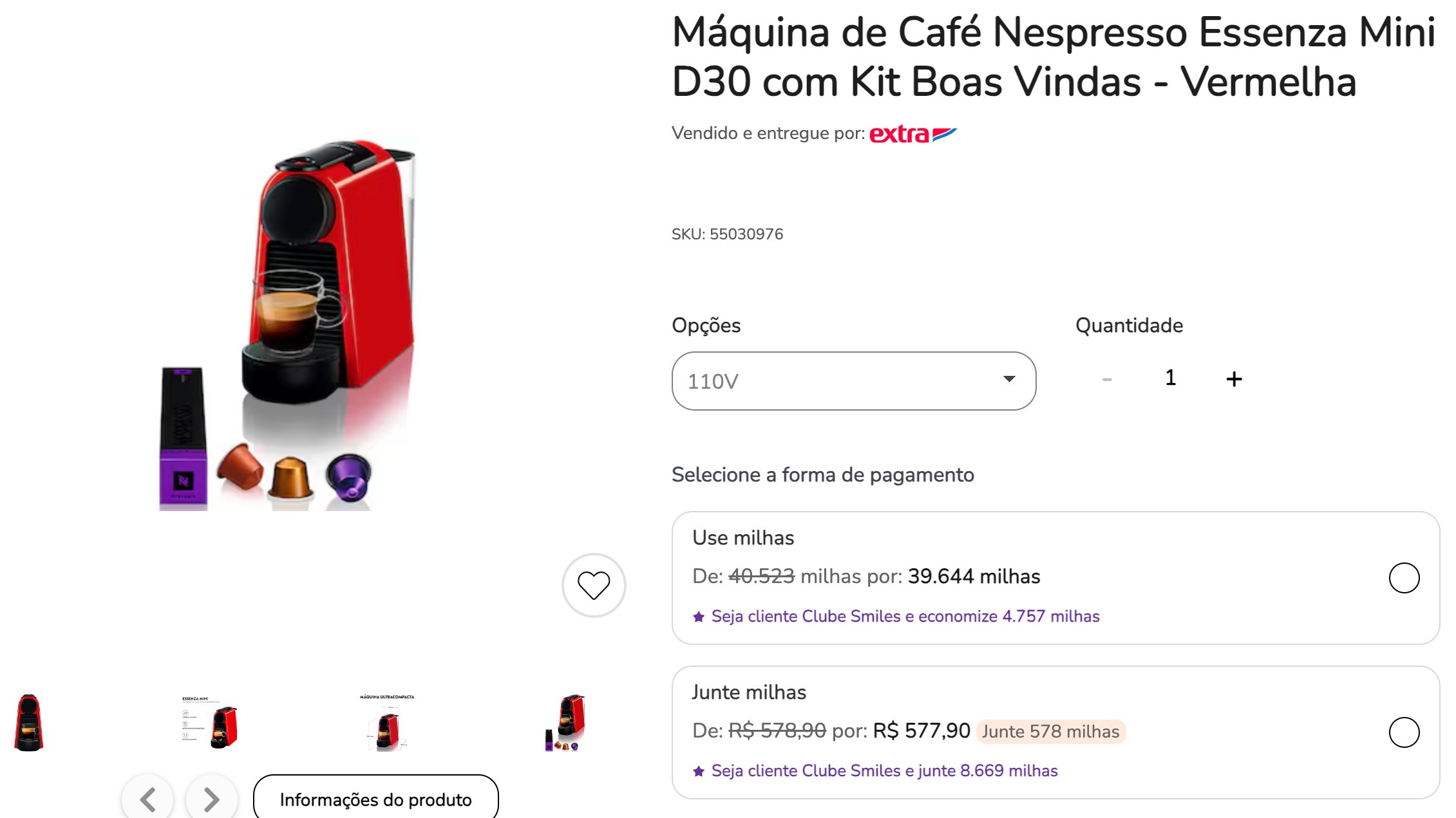 A Smiles está oferecendo até 15 milhas por real gasto na compra de cafeteiras vendidas pelo Extra dentro do Shopping Smiles. A oferta é válida até às 23h59 desta quarta-feira (17) ou enquanto durarem os estoques.