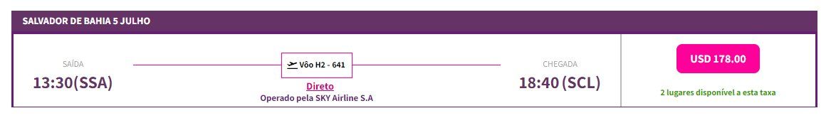 Com essa nova rota, a companhia aérea low cost espera conectar Salvador a outro destino atraente na América Latina. Os voos diretos para Santiago serão uma oportunidade para os brasileiros conhecerem a neve e também para que mais chilenos venham ao Brasil. Com isto, a SKY passa a ser a única companhia aérea com voos diretos para a capital chilena.