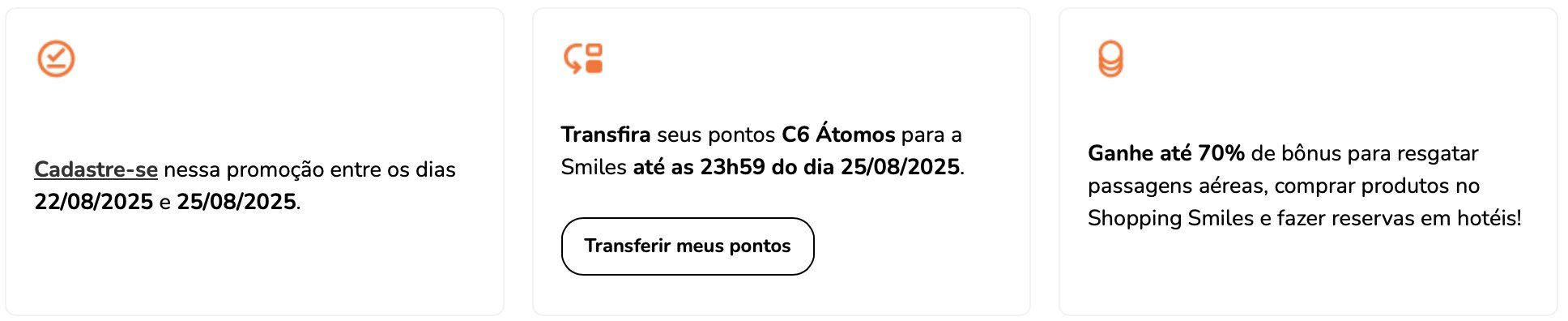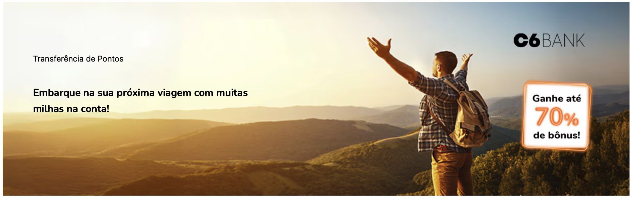 Essa pode ser uma boa oportunidade para você transferir pontos do C6 Bank para a Smiles e receber até 70% de bônus. Lembrando que para ser elegível a maior bonificação, você precisa ser assinante do Clube Smiles e/ou Diamante.