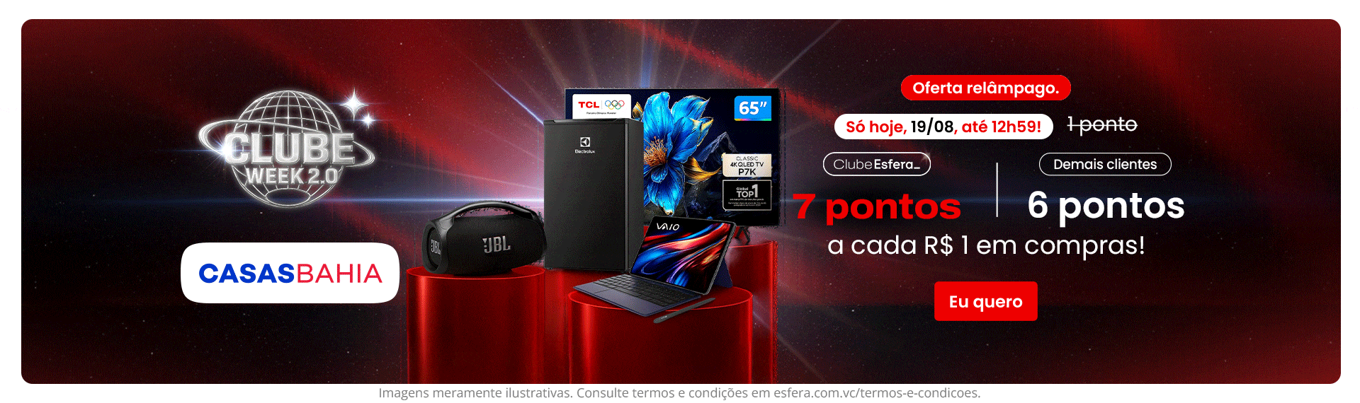 - Casas Bahia: até 7 pontos por real gasto para assinantes do Clube Esfera e 6 pontos por real gasto para os demais clientes – somente até as 13h de 19/08/2025 – clique aqui;