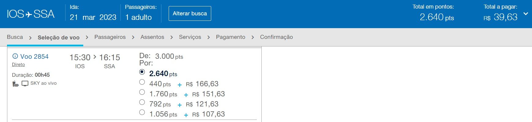 Confira abaixo um exemplo de resgate para quem possui o cartão Azul Itaú Internacional. Repare que a passagem tem o custo de 3.000 pontos o trecho, porém, com o desconto de 12% (cartão Azul Internacional), está saindo por 2.640 pontos.