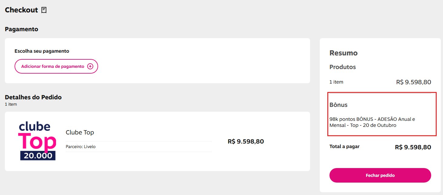 • Campanha válida para adesões ao Clube Livelo Top realizadas nas modalidades de pagamento anual e mensal.