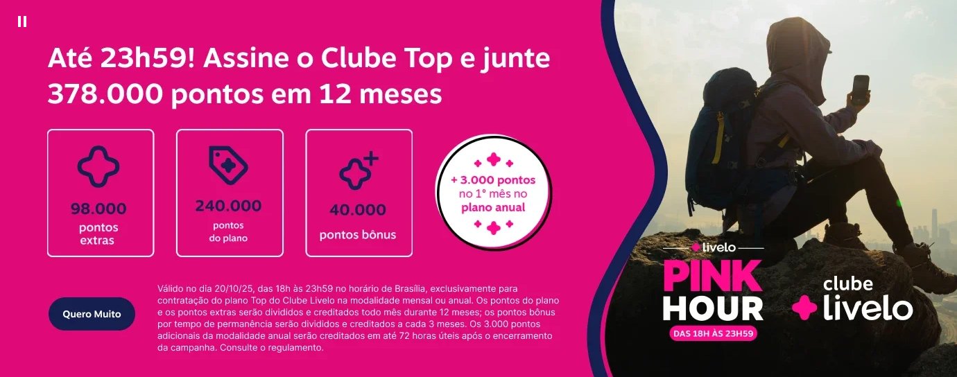 A Livelo está realizandoa a Pink Hour⏱️ E nesta oferta, o programa está oferecendo 98.000 pontos bônus para quem assinar o Clube Livelo Top na modalidade anual. Os pontos serão distribuídos ao longo de 12 meses e vão gerar um custo por mil pontos (CPM) a partir de R$ 22,85. A oferta é válida apenas até as 23h59 de hoje (20). Confira!