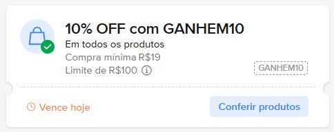 - 10% off, chegando até R$ 100 de desconto, em compras a partir de R$ 19, com o cupom ‘GANHEM10’ [sem aspas].