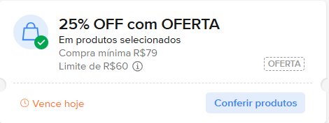 - 25% off, chegando até R$ 60 de desconto, em compras a partir de R$ 79, com o cupom ‘OFERTA’ [sem aspas]
