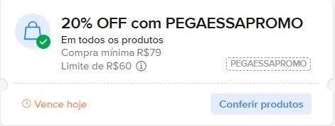 - 20% off, chegando até R$ 60 de desconto, em compras a partir de R$ 79, com o cupom ‘PEGAESSAPROMO’ [sem aspas]