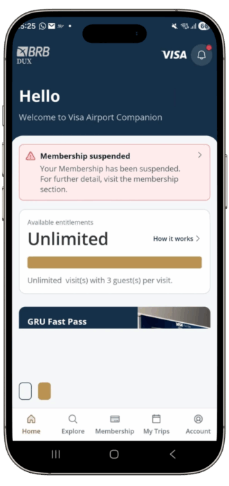 Ao acessar o aplicativo, consta a mensagem informando a suspensão do programa Visa Airport Companion. O exemplo abaixo é de um cartão BRB DUX Visa. A imagem com o aviso pode ser vista abaixo. Ao tenta gerar o QR Code da associação, este também consta como cancelado. Confira abaixo: