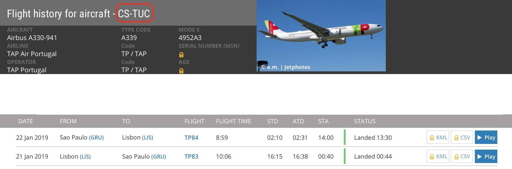 Pesquisamos o histórico de voos das matrículas dos novos A330-900neo, ambos foram utilizados na rota de São Paulo x Lisboa nos últimos dias: