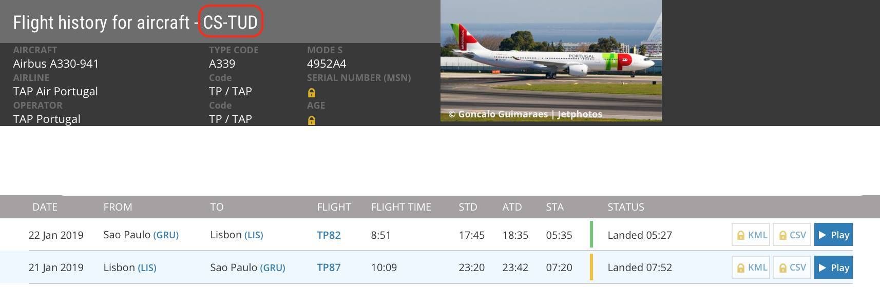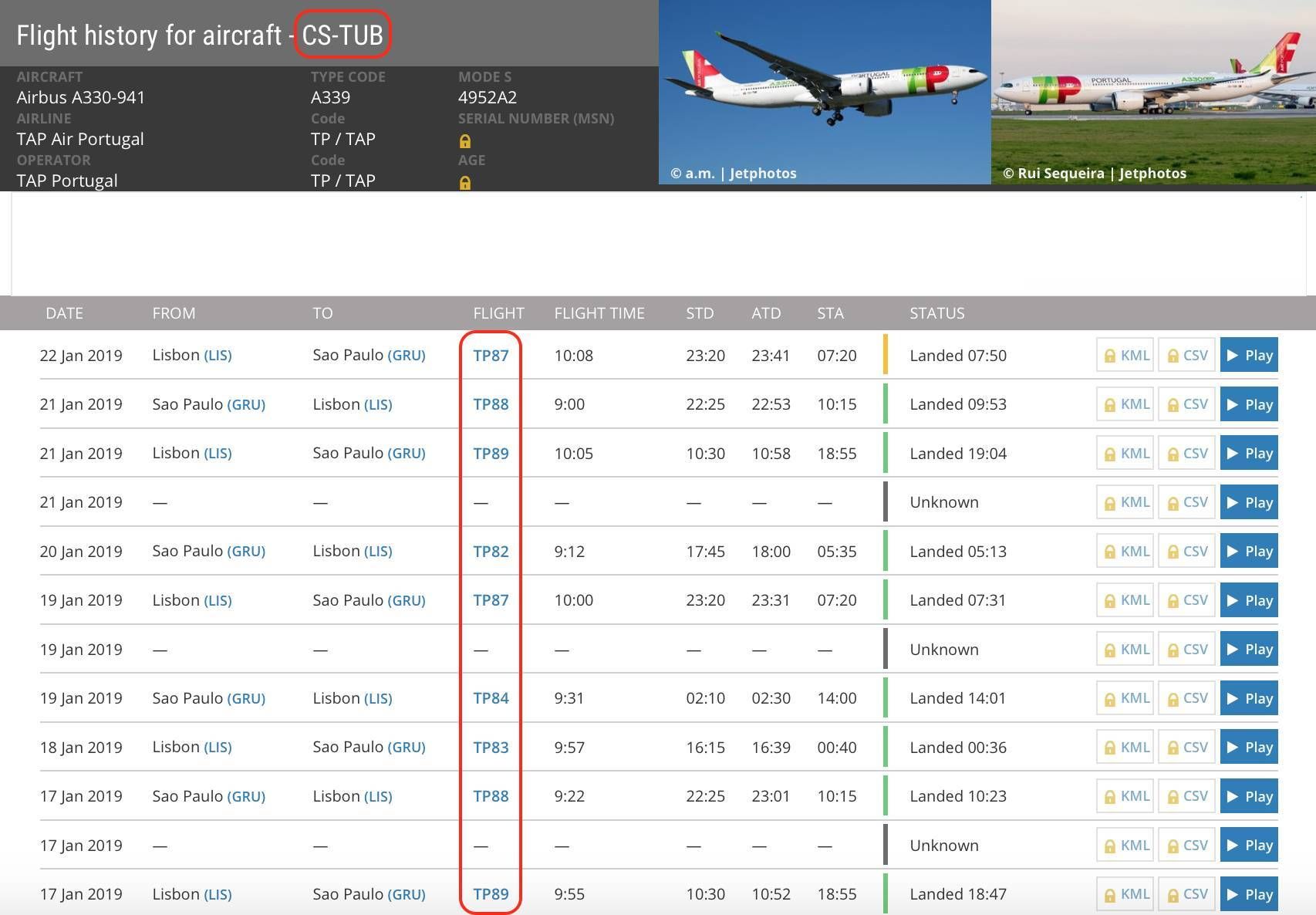 O CS-TUB, primeiro A330neo da companhia, continua sendo utilizado na rota de São Paulo, reparem que o voo varia dependendo do dia. Lembrando que a TAP opera até 3 voos diários nessa rota, sendo que somente um deles é operado com o NEO inicialmente: