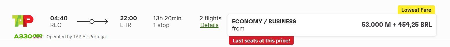 Em nossas buscas, encontramos bilhetes por 53 mil pontos + taxas o trecho de ida. Veja a seguir os exemplos de emissão: