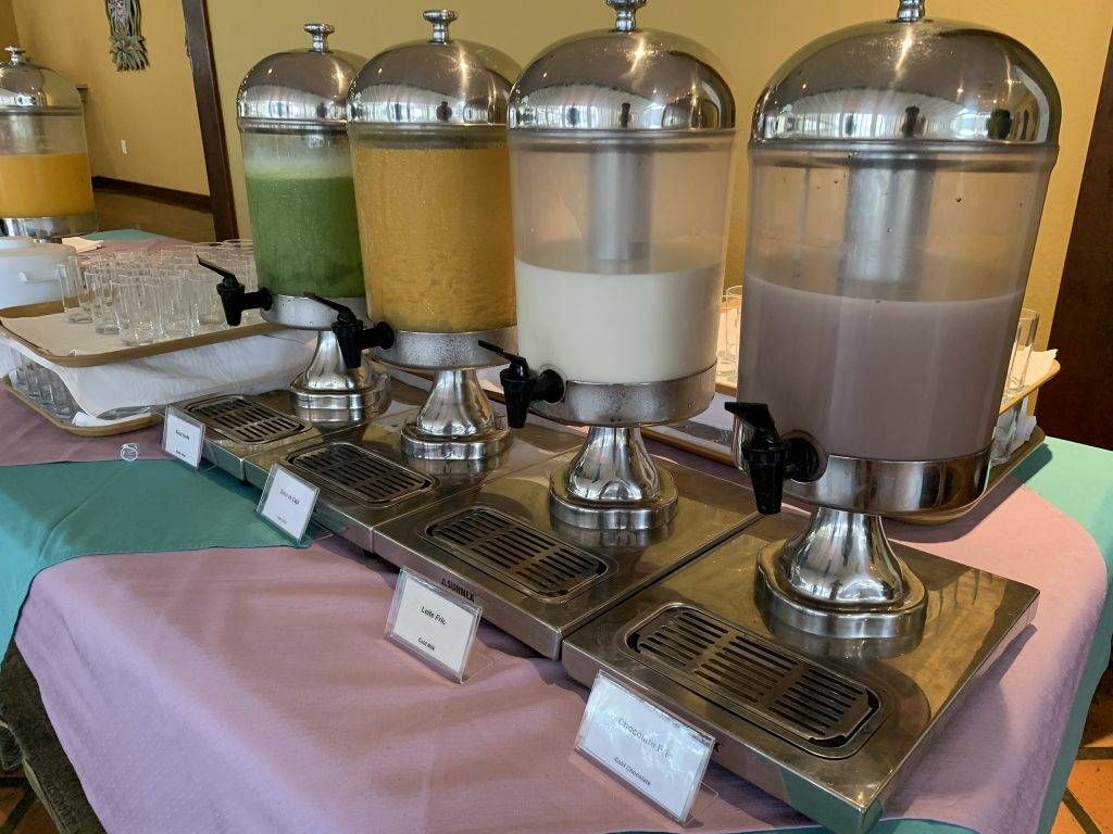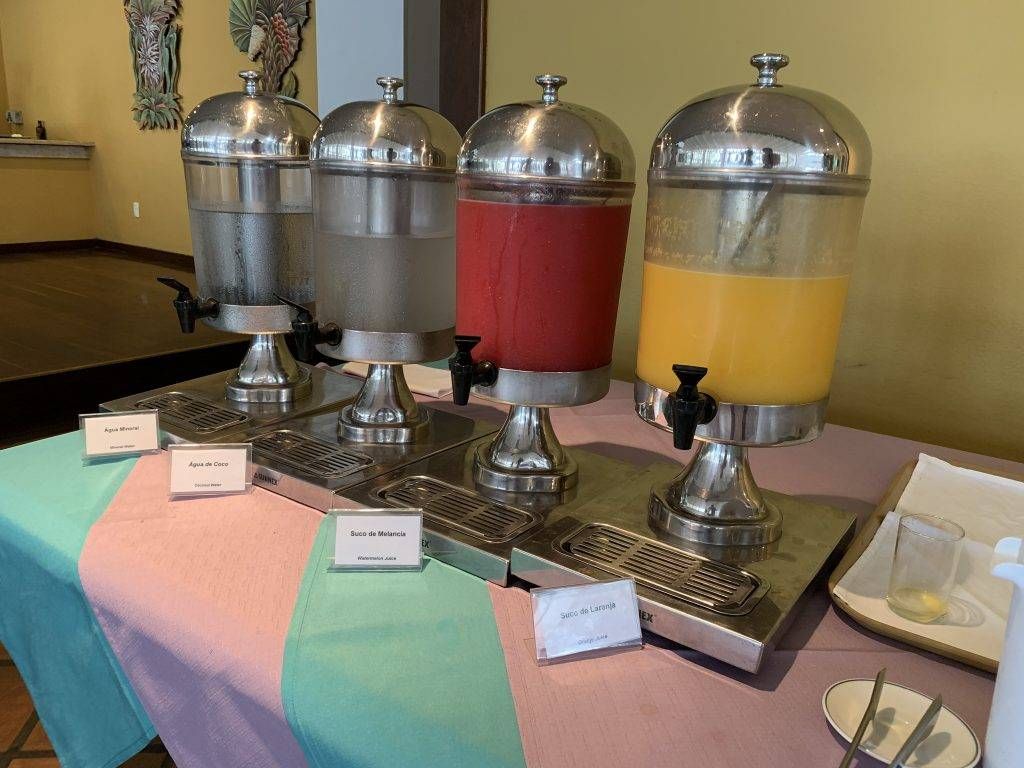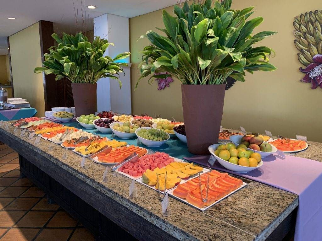 No restaurante principal, as refeições são sempre em estilo buffet, com bastante opção. No café da manhã há diversos tipos de pães, doces e salgados, frios, frutas até falar chega, tapioca, ovos, omeletes, bolos, cereais, bebidas quentes etc etc etc. Não consigo pensar em nada tradicional de café que o Transamérica Comandatuba não ofereça! Rs… O café em si é do tipo coado – mas saiba que você também pode pedir expresso se preferir. E a fila para pegar os ovos e tapiocas nunca chega a demorar muito (quer dizer, pelo menos às 7 da manhã, quando a gente abria o restaurante! Rs).