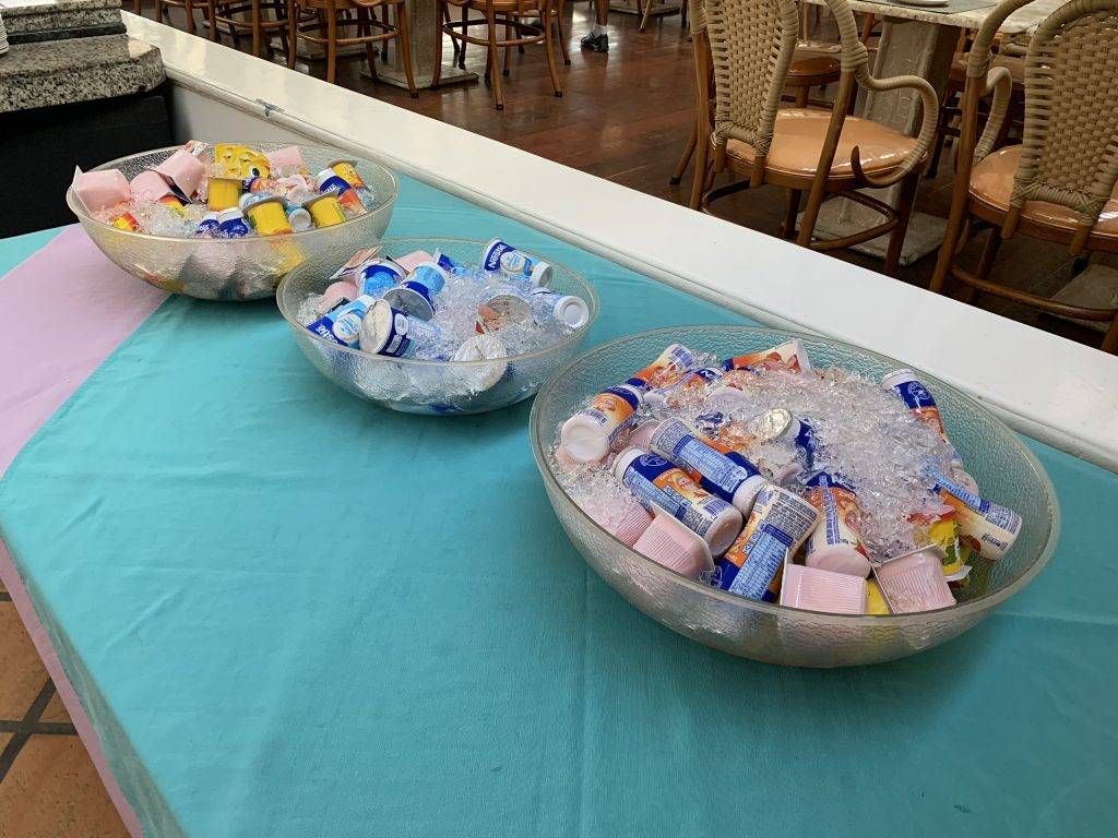 Já na praia são servidos mais petiscos e besteirinhas ou coisas fáceis de comer sem ter que obrigatoriamente sentar numa mesa. Muita gente pega um prato de batata frita e iscas de peixe e leva para as cadeiras da piscina – eles são bem tranquilos quanto a comer ao redor do hotel.
